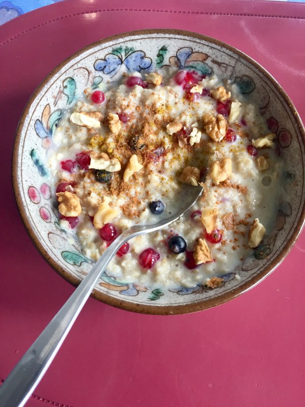 But, how did I get to this point of attachment with porridge of all things you may ask?! Well, it didn’t happen overnight and it took experimentation. For any of you who know my eating habits, I generally avoid sugar as much as possible. And so I wasn’t willing to compromise on my morning meal. But I think that porridge without any added sugar aside from fresh fruit is wonderful. The way I make my porridge is below. Try it if you like and add maple syrup, dried fruits, etc. if you’re not as fussed with the sugar 😉